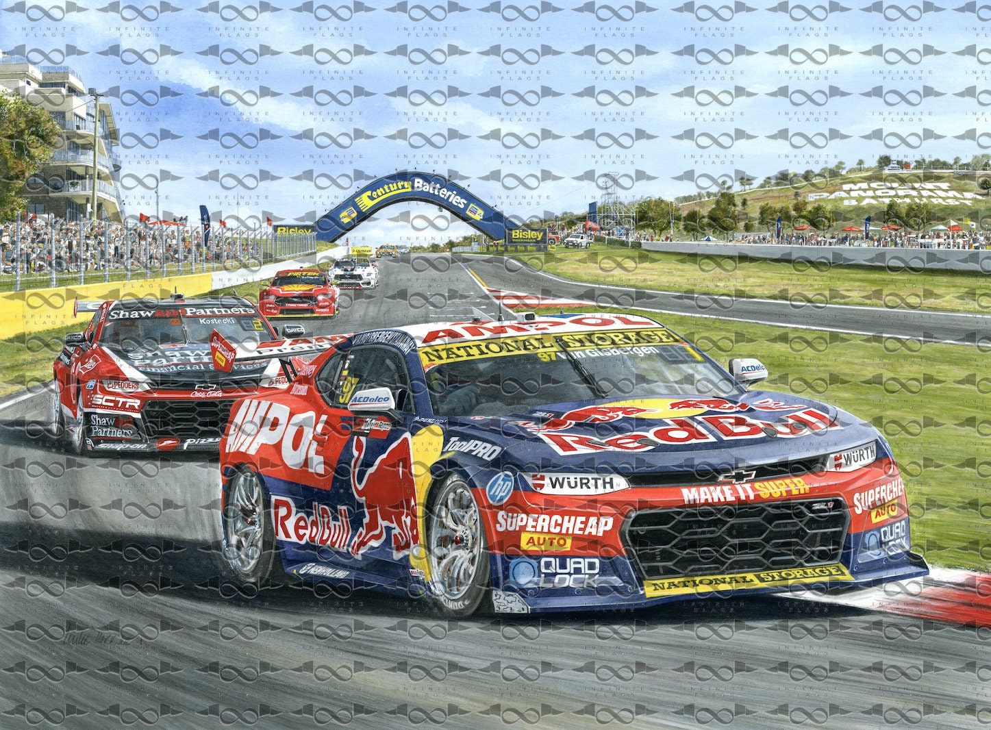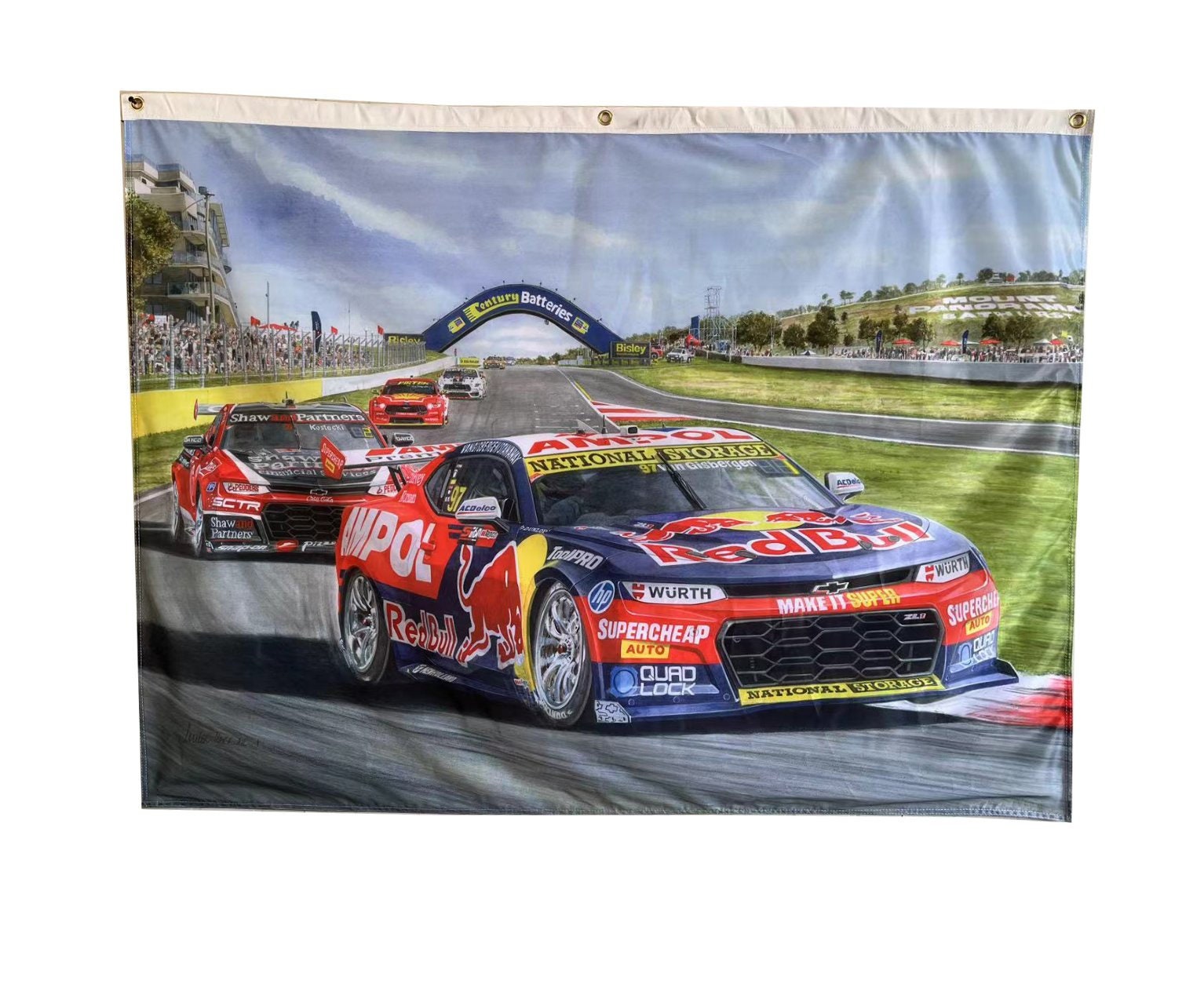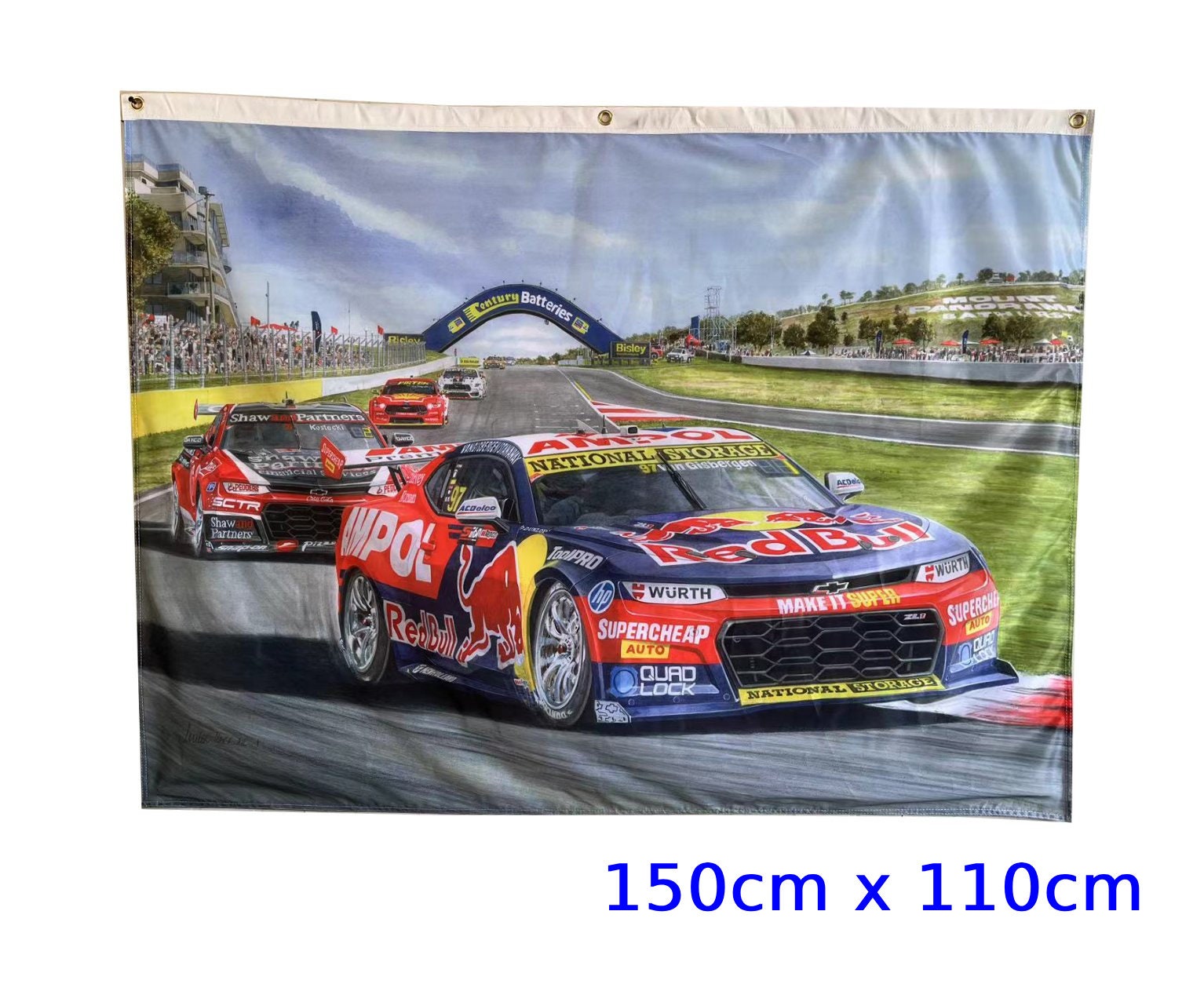 Brand new and never flown Bathurst 2023 - My Generation - Gen 3 Chevrolet Camaro v Ford Mustang flag/banner flag/banner for sale. Flag/banner measures 150cm x 110cm in size (approx) and is made from polyester (min. min. 110gsm material used).